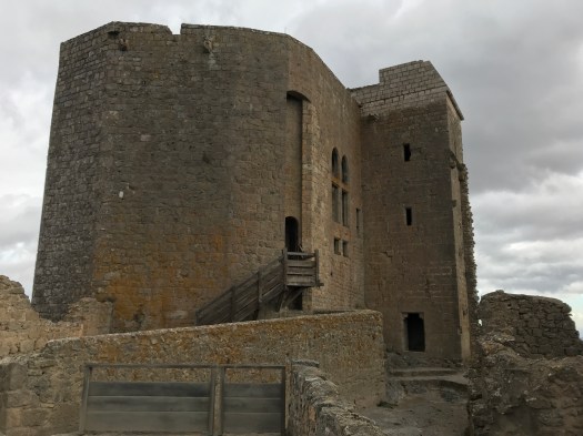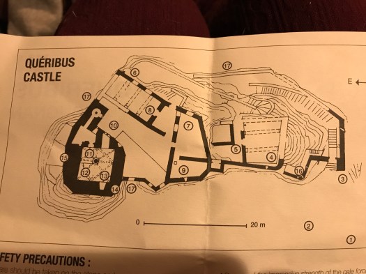 Una strada in salita , percorribile con qualsiasi veicolo, giunge fino al parcheggio del primo castello. Dopo il pagamento del biglietto, si procede a piedi, in salita e lungo una ripida scalinata nella roccia per accedere alla costruzione che si presenta su tre livelli; varie stanze sono ancora presenti e si può riconoscere il locale della cisterna e delle zone dove si riunivano i devoti. Una scala a chiocciola porta su una torre dalla quale è possibile ammirare un panorama fantastico . Guardandosi intorno a 360 gradi possiamo scorgere, da un lato, le cime innevate dei Pirenei ma, dall’altro , anche il mare. Lungo le mura del castello si notano tutte le fessure che servivano agli arcieri e ai combattenti per la difesa, sotto assedio. Il castello è alto quasi 800 mt, e, per come è stato architettonicamente costruito, bastavano 15 persone per garantire la difesa della struttura.