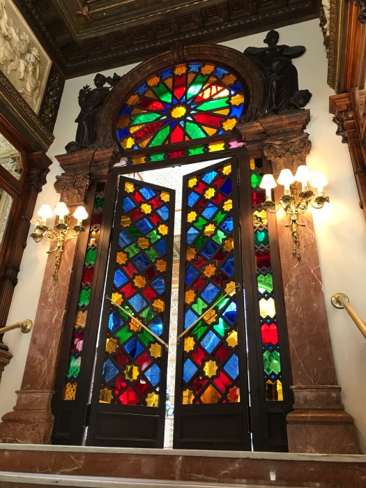 Già l’ingresso è splendido, con la sua porta a vetri colorati che, dopo una scalinata con vetrate che mostrano due stanze per la lettura, dedicate ai soci, si accede all’atrio, prettamente in stile arabeggiante , che ricorda le decorazioni dell’alambra.