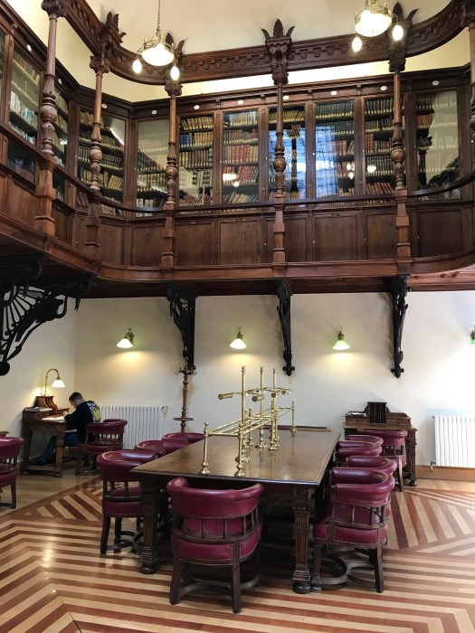 La biblioteca, con i suoi tavoli da scrittura e i libri riposti in una buaserie in legno sopraelevata, è incredibilmente favolosa.
