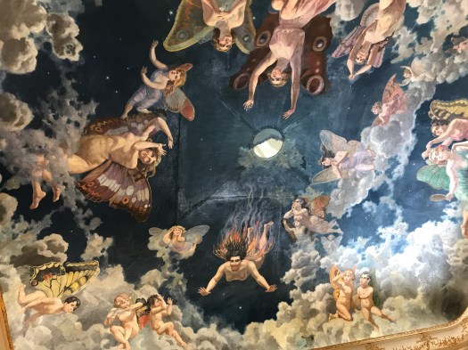 La toilette delle signore , con gli specchi enormi e il soffitto decorato con la dea Selene, diversi putti e una donna in fiamme che, da ogni angolazione ci si pone, sembra venire in contro al visitatore, è un locale che riporta indietro nel tempo.