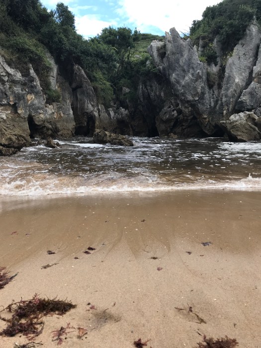 Il giorno seguente , al mattino, con i pelosi, ci rechiamo a piedi , a visitare la spiaggetta di gulpiyuri; questa piccola spiaggia, risulta essere particolare perché si trova interna rispetto al mare , separata da esso dalla scogliera che, bucata in alcuni punti, permette l’entrata e la fuoriuscita delle onde, formando un piccolo laghetto e una spiaggetta che aumenta di dimensioni in caso di bassa marea .