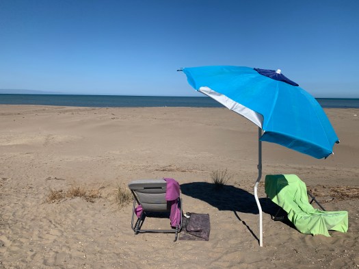 Una spiaggia nel Delta dell’Ebro dove eravamo già venuti nel 2015, ci sembra un luogo adatto . Non si tratta della striscia di terra e della zona delle saline dove si trovano i fenicotteri ma di una spiaggiona lunga e selvaggia e sopratutto poco frequentata, dove avevamo dormito una notte ventosa, quattro anni fa.