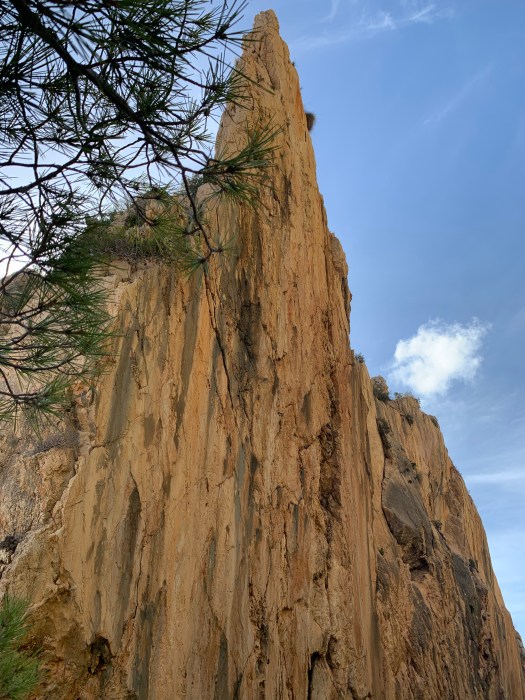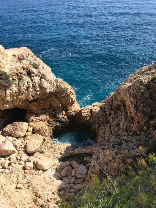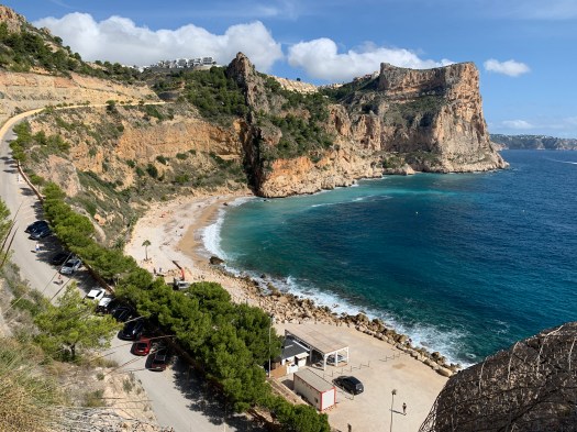 Partenza in direzione sud, con sosta pranzo a Benidorm, in un parcheggio della città, ma senza sosta per visitarla. Abbiamo invece fatto una tappa presso la playa des Arcos. Lasciato il truck al parcheggio, siamo andati a piedi lungo una strada in discesa, per raggiungere un sentiero corrispondente ad una faglia , e vedere da sopra la spiaggia degli archi ed il punto in cui la roccia è slittata, in corrispondenza di una faglia. Dopo la ripida discesa asfaltata, abbiamo precorso il breve sentiero che prevede qualche gradino ed un terreno leggermente sterrato con ciottoli lungo il quale la Queen, a seguito degli altri due pelosi, ha dimostrato la sua leggiadria, salterellando di gradino in gradino, e superando qualsiasi ostacolo trovasse sul suo percorso.