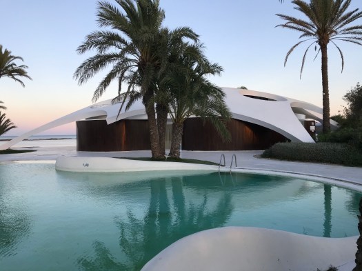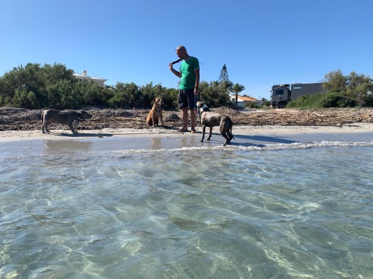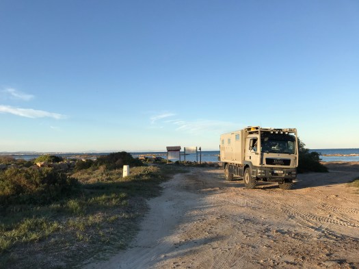 Dopo aver trascorso la mattinata ancora a Torrevieja, ci spostiamo nel pomeriggio verso porto Palo. C’è una zona che, negli anni passati non abbiamo mai visitato approfonditamente ed è proprio quella a sud di Torrevieja, che costeggia il Mar Minor. Una lingua di terra lunga circa venti chilometri si estende da un capo all’altro della costa creando una specie di lago, anche se non è corretto definirlo tale, in quanto è aperto al mare in più punti. Si tratta di una zona, in parte protetta a parco, ricca di specie diverse di volatili fra i quali i fenicotteri rosa. Dopo aver percorsa parte della costa che è chiusa al pubblico in quanto zona militare e che risulta alquanto paludosa, ci rechiamo ad un capo della lingua di terra, al parco delle saline di San Pedro al pinatar, dove non si trovano molte costruzioni ma, alle spiagge, è vietato l’accesso ai cani. Preso nota della bellezza del luogo ma dell’impossibilita di camminare con i pelosi nel parco naturale, rimontati sul HungryWheels, ci rechiamo, seguendo la costa Del Mar Minor, dalla parte opposta, fino ad avvicinarci a capo de Palo e decidere di percorrere l’intera striscia di terra che passa per il nucleo turistico della Manga, fino ad affacciarci al punto opposto, presso la zona parco, dove eravamo in precedenza. Percorsa la lingua di terra in tutta la sua lunghezza, abbiamo constatato che si tratta di una area magnifica dal punto di vista delle spiagge e del mare ma terribile per lo scempio costruttivo che vede tantissimi ed enormi grattacieli che ospitano migliaia di turisti nei mesi estivi ma, che rimangono completamente deserti, trascorso agosto. Sulla spiaggia, ci sono anche tante belle ville singole, ma senza un preciso stile architettonico che vede case arabeggianti affiancarsi ad altre, in stile moderno e altre in stile spagnolo. Parcheggiamo il truck su una spiaggia desolata e bellissima anche se coperta da alghe secche e detriti, probabilmente causati dalle inondazioni e dal brutto tempo delle scorse settimane. Veniamo rapiti dal colore azzurro cristallino delle acque del mare. Una costruzione singolare a forma di ufo, che ospita il bar Colladores, ci colpisce particolarmente mentre la ispezioniamo e la nostra fantasia si scatena, pensando di possederlo ed utilizzarlo come casa.