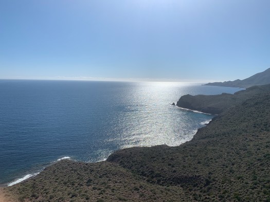 Per pranzo, siamo tornati in una spiaggia molto carina ma anche molto popolare; infatti cala isleta , scoperta lo scorso anno, a sud di Rodalquilar, era affollata da diversi camperisti che, parcheggiati a spina di pesce, si sono stabiliti in questo luogo per trascorrere un po’ di tempo al sole.