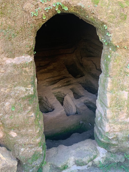 Fatta colazione e la passeggiata con i pelosi, mettiamo in moto il truck e ci dirigiamo sul percorso sterrato che, a poche centinaia di metri, ci conduce fino alla necropoli romana. Una intera montagna è stata scavata con gallerie che ospitano tanti buchi dove venivano seppelliti i morti .
