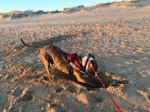 Prima del tramonto, io e Odino decidiamo di andare un po’ in spiaggia a passeggiare e, mentre tento invano di scattare qualche foto al mio cane, lui viene preso dal suo solito raptus di scavare tunnel nella sabbia, suscitando l’ilarità dei passanti.