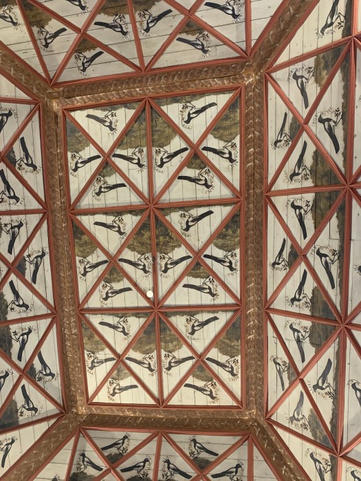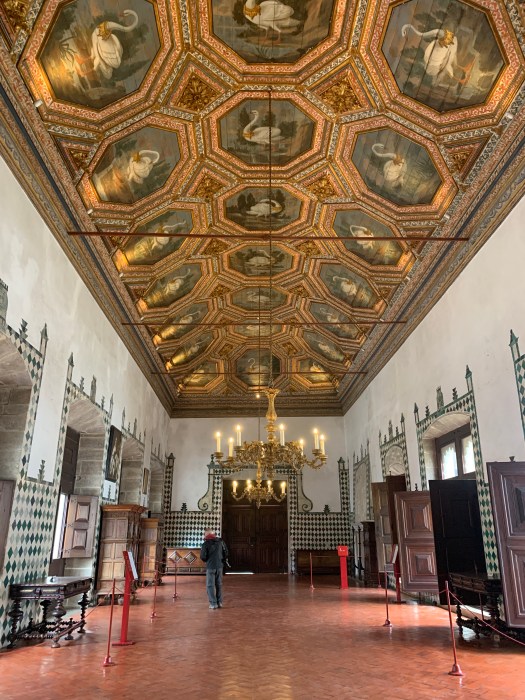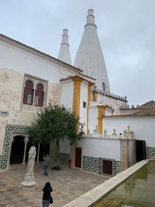 Acquistato il biglietto cumulativo (si risparmia) per i musei che vogliamo visitare, trovandoci in centro, abbiamo deciso di cominciare con la visita del Palazzo Nazionale di Sintra, riconoscibile nello skyline da due grandi comignoli gemelli a forma di cono rovesciato.