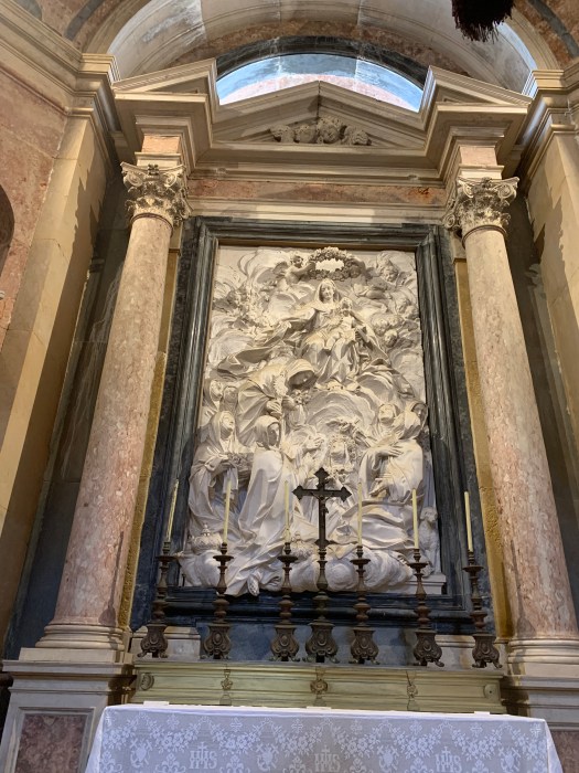 Visitata per prima la chiesa barocca con torri gemelle adiacente al palazzo, ho apprezzato molto le sue statue e i bassorilievi in marmo di Carrara .