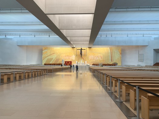 Quest’ultima struttura di forma circolare con 12 grandi porte in ferro alte 9 metri, appare anche all’interno estremamente moderna e priva di patos. Lunghe file di sedili sono sistemate come in un auditorium , divise da un lungo corridoio che porta all’altare dove un cristo moderno, scompigliato è in croce, davanti ad un favoloso mosaico dorato , che colpisce l’occhio appena entrati dalla porta centrale.