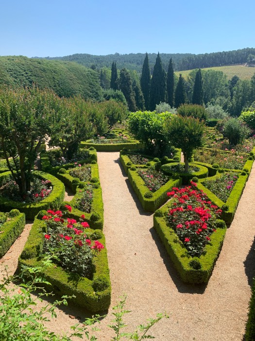 Il giardino , perfettamente curato da molteplici giardinieri, è un tripudio di rose di vari colori e siepi finemente potate con forme differenti.