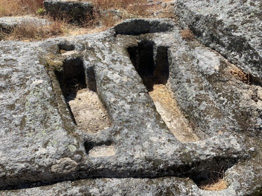 Le case in pietra, quasi tutte ben ristrutturate, si elevano sopra o si appoggiano ad enormi massi tondeggianti e gli stretti vicoli dove con difficoltà riesce a passare solo un auto, si inerpicano in direzione del castello che sorge a fianco ad una chiesa e alla necropoli.