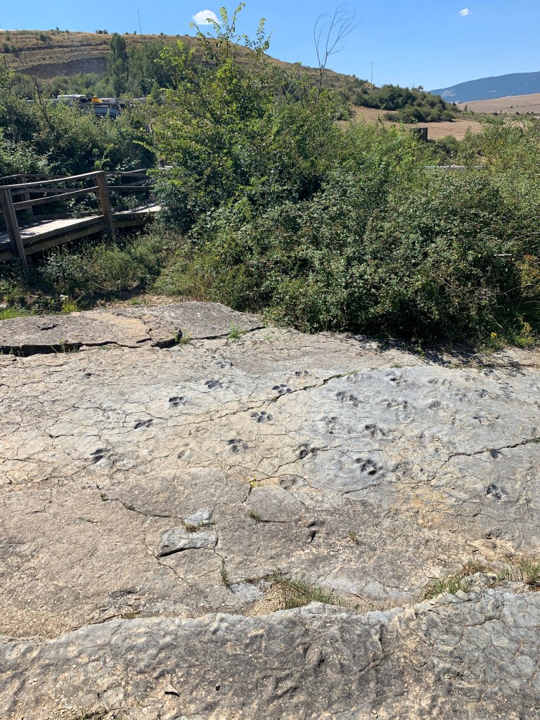 Lungo la strada, cartelli segnalano i luoghi dove è possibile vedere le impronte rimaste indelebili nella roccia ed identificabili grazie a pannelli illustrativi ed alla colorazione delle impronte, per renderle più visibili.
