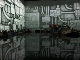 Sulle pareti degli hangar, vengono proiettati i quadri degli artisti che illuminano il buio dell’ambiente creando fantasiose rappresentazioni a suon di musica. Le immagini si riflettono nell’acqua creando un effetto molto suggestivo.