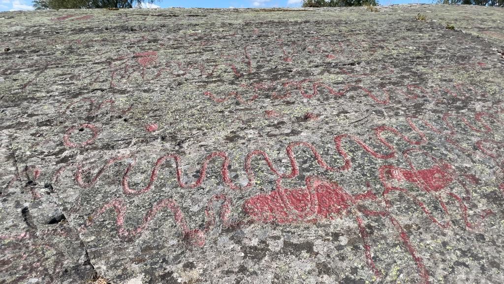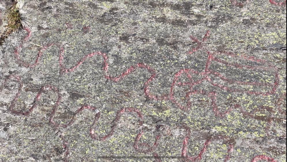 All’inizio di una passeggiata di 1,8 km , vicino alla riva del lago, ovunque ci giriamo, ci sono simboli sugli scogli piatti e lisci.