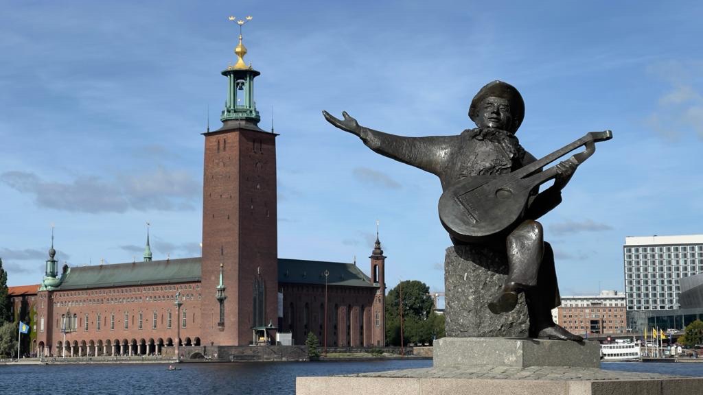 Per concludere la perlustrazione, ci spostiamo sulla limitrofa isola Riddarholmen per osservare l’omonima chiesa del XIII sec che ospita le tombe dei reali dal 1290 ed il suo campanile con la parte terminale a punta in ferro. Dietro la chiesa, sulla Evert Taubes Terrass ( non è una terrazza ma uno spiazzo affacciato sul mare), si può vedere nell’isola di fronte, l’enorme edificio del municipio , lo Stadshuset , con la sua torre a forma quadrata (visitabile) e la cupola dorata con lo stemma a 3 corone.