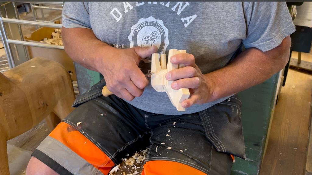 Il simpaticissimo Niels del laboratorio Grannas, ci ha accolti con entusiasmo e ha realizzato a mano , per noi, un cavallo da un pezzo squadrato di legno di pino.