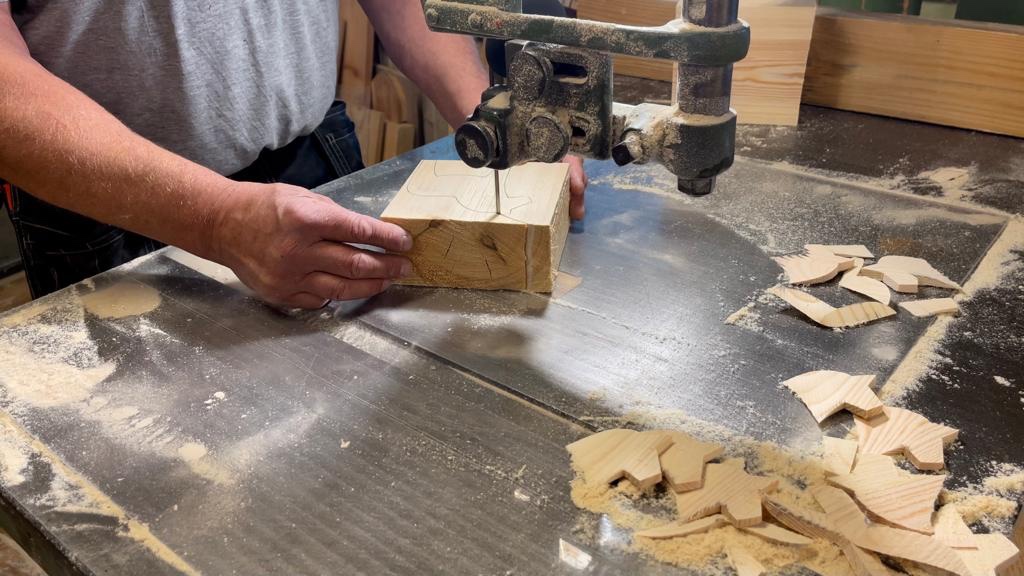 Con un timbro, ha segnato la sagoma del cavallo sullo zocco di legno e poi, lo ha segato con un macchinario.