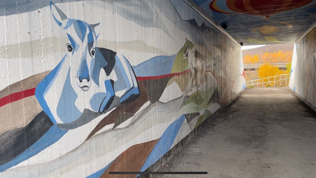 Percorrendo il sentiero, siamo stati attirati da una litania musicale che ci ha condotto fin sotto ad una galleria completamente dipinta da una artista svedese che ha rappresentato, nel dipinto, la vita delle renne e una cascata nelle varie stagioni dell’anno, oltre al sole di mezzanotte e alle luci del Polo artico.