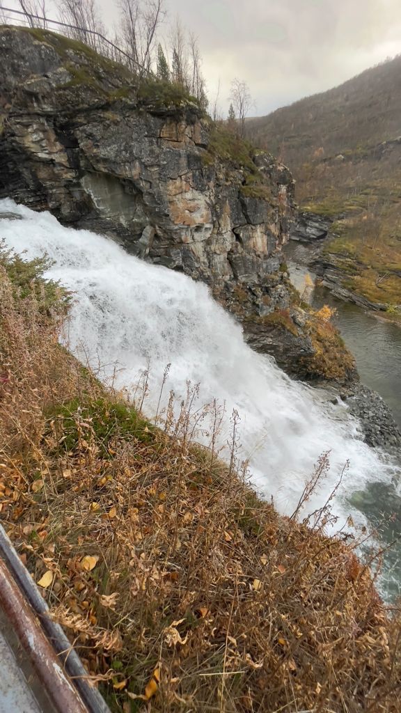 Dopo averne percorso un tratto, abbiamo incontrato una bella cascata a lato della strada ; siamo poi passati sulla strada parallela, la 99 che, nel versante svedese.
