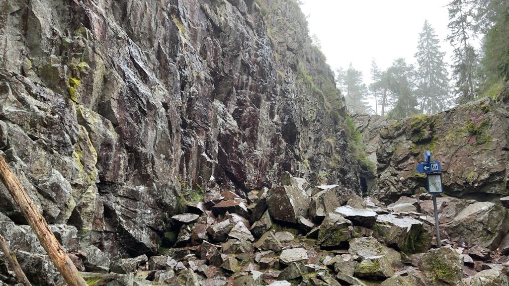 Giunte in fondo alla prima discesa ripida, abbiamo finalmente visto il muro di roccia che, da un lato, si ergeva imponente mentre, dal lato opposto, il terreno presentava una linea più morbida.