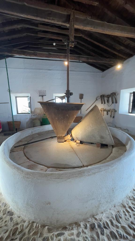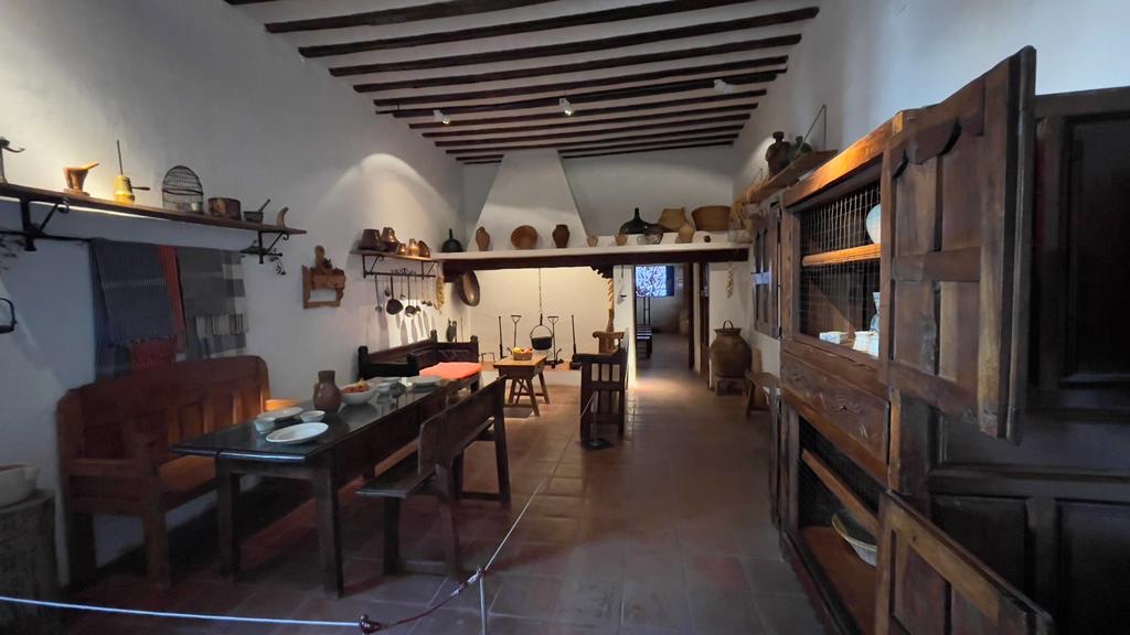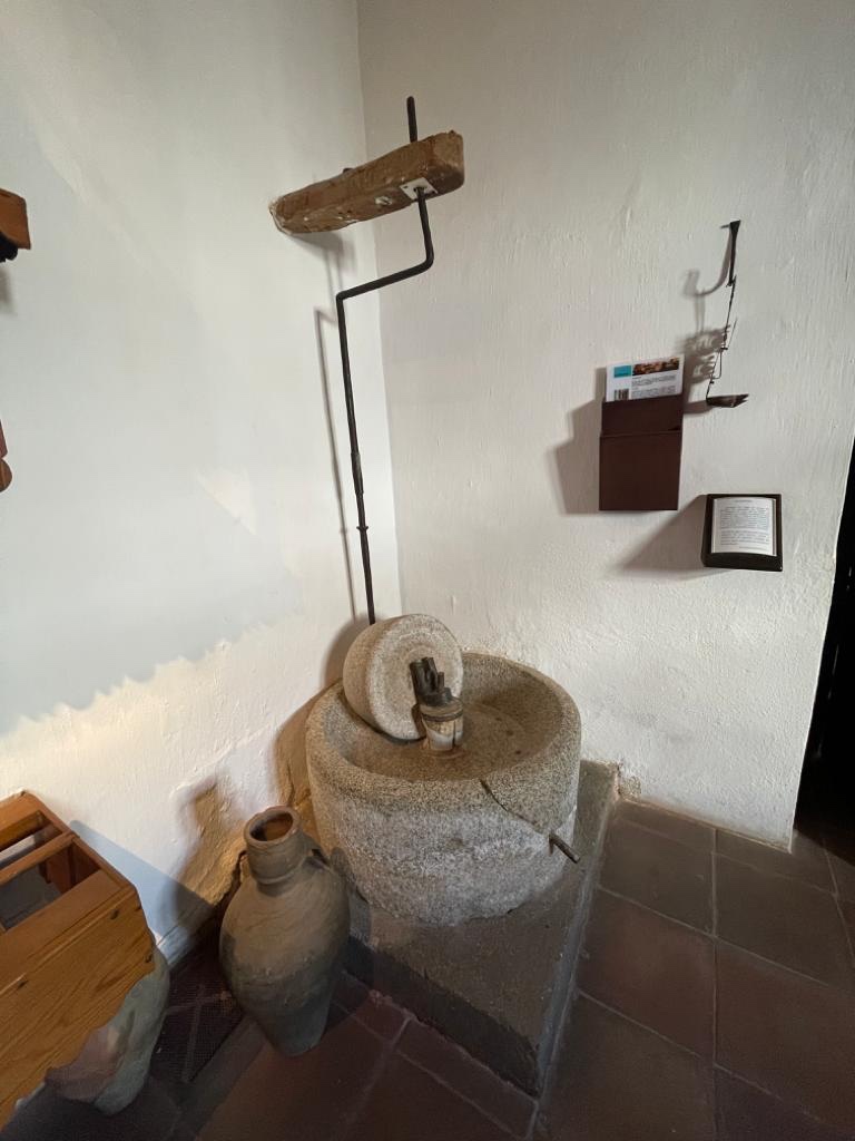 Il soggiorno e la cucina, al piano terra, con il gran camino che occupa tutta una parete, ospita anche una macina manuale per l’olio e diverse giare e madie.