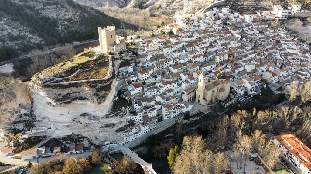La roccia che ospita il castello del villaggio, in posizione sottostante ad esso, si apre con delle finestre e delle nicchie che ospitano mirador , ben visibili dalla strada imboccata per Jorquera.