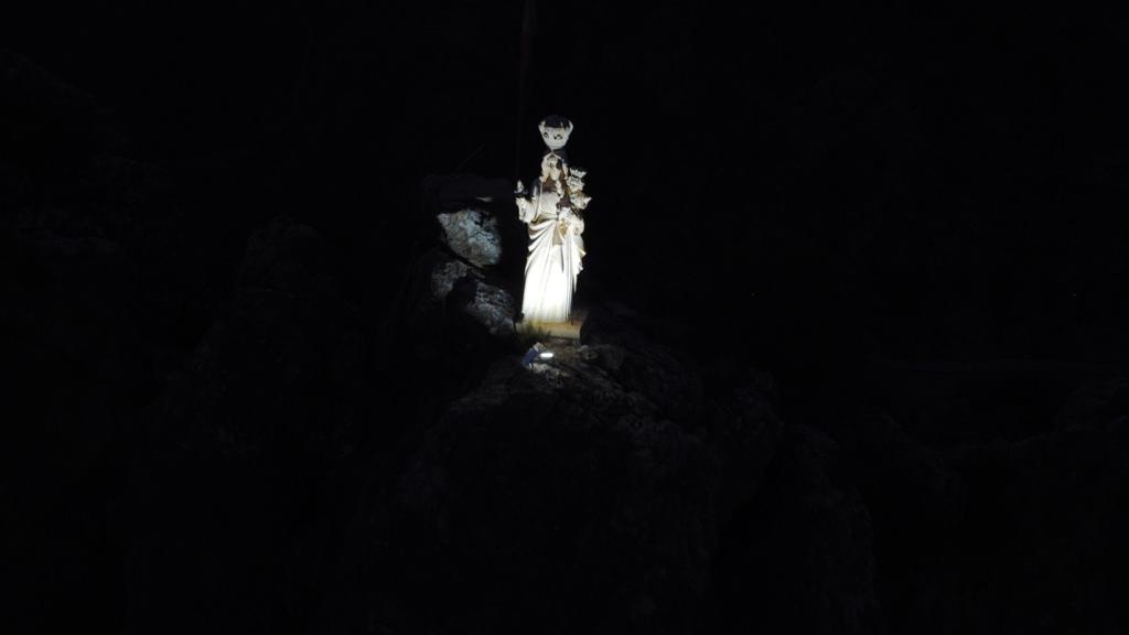 Rimandiamo la visita a domani e ci limitiamo ad apprezzare una madonnina illuminata, posta sul cuccuzzolo di una roccia, proprio sopra il parcheggio, di fronte al villaggio.