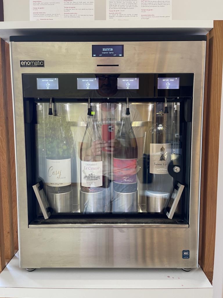 Nella parte bassa dell’edificio, un frigo dispenser ospita 4 differenti bottiglie: un bianco, un rosè, e due rossi di differenti cantine che, tramite una card rilasciata al piano di sopra, è possibile assaggiare e poi votare.