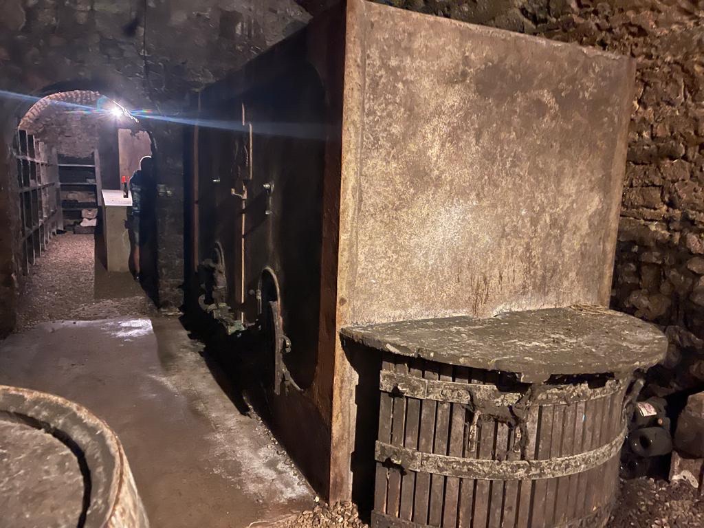 Scesa una scala in pietra dall’ stanza del negozio, ci sia aggira per corridoi tenebrosi e pieni di fuliggine che copre miglia di bottiglie vecchie anche di cinquanta anni e custodite in angoli segreti.