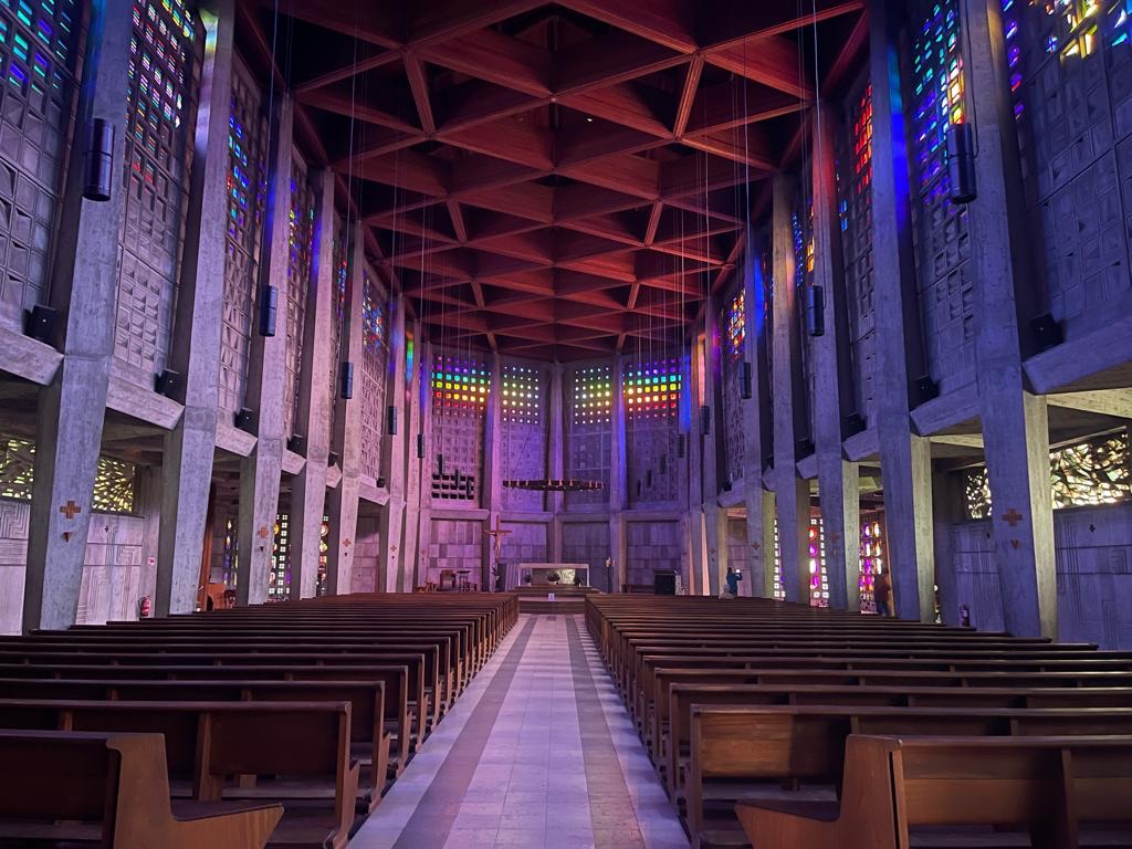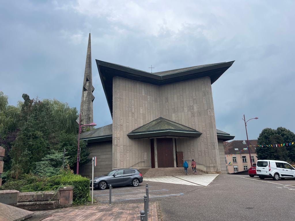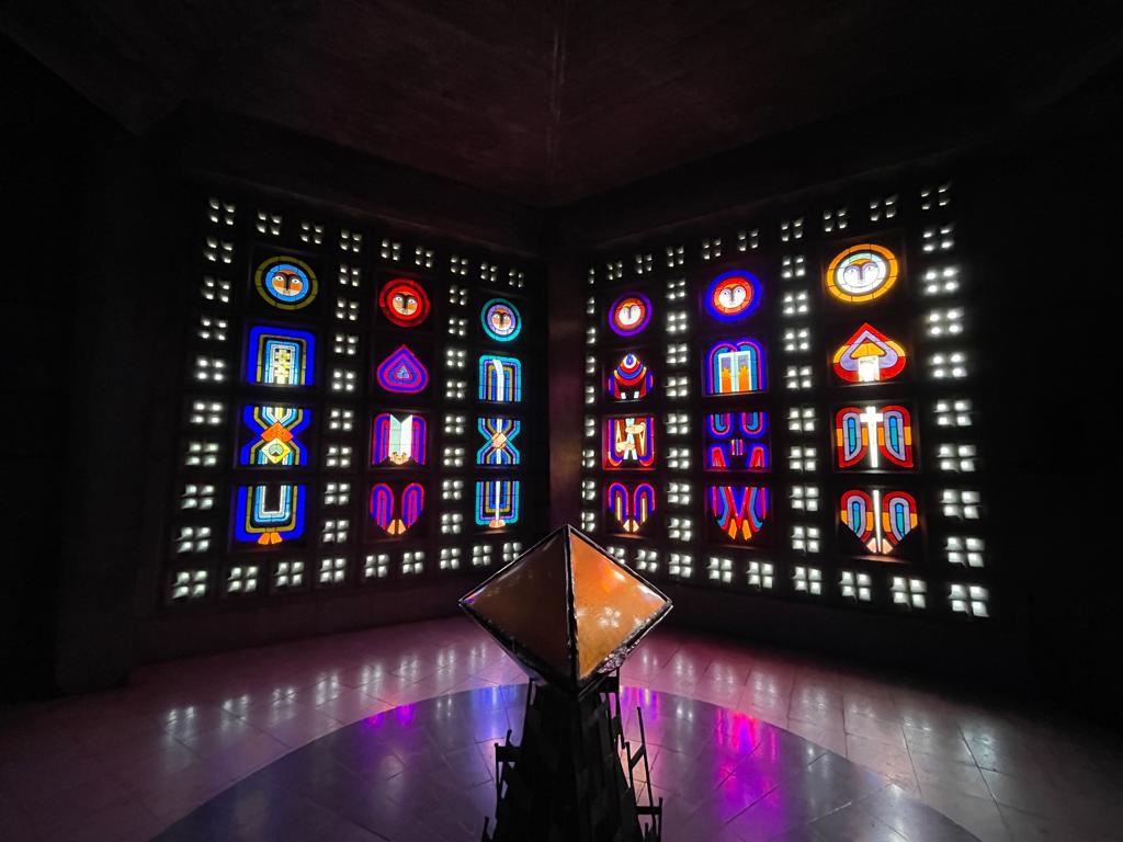 Il primo luogo che ha attratto la nostra attenzione è stata la chiesa che si affaccia sul fiume. E’ un edificio degli anni ‘50 del secolo scorso; all’esterno molto austera nelle forme e, all’interno, molto buia. La sola luce che illumina la chiesa entra dalle coloratissime vetrate moderne, formate da migliaia di cristalli multicolori, rettangolari che, lungo i due lati della chiesa non disegnano nessuna forma in particolare mentre, ai lati dell’altare, sono disposti a formare delle figure umane.
