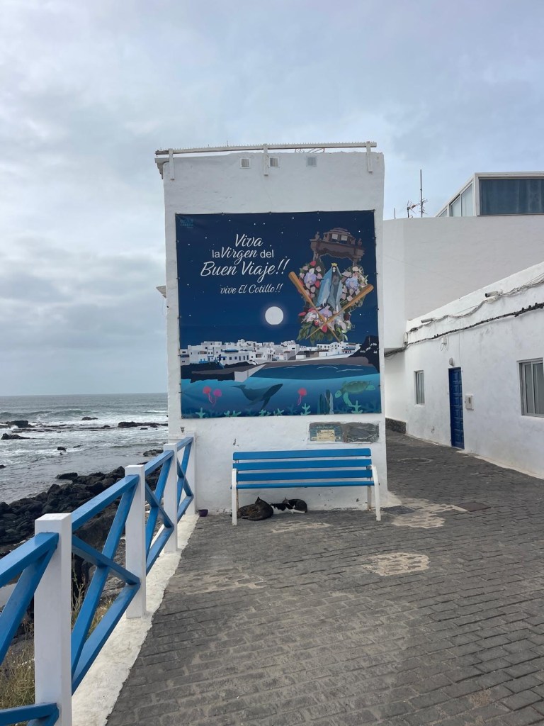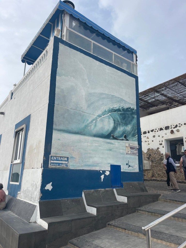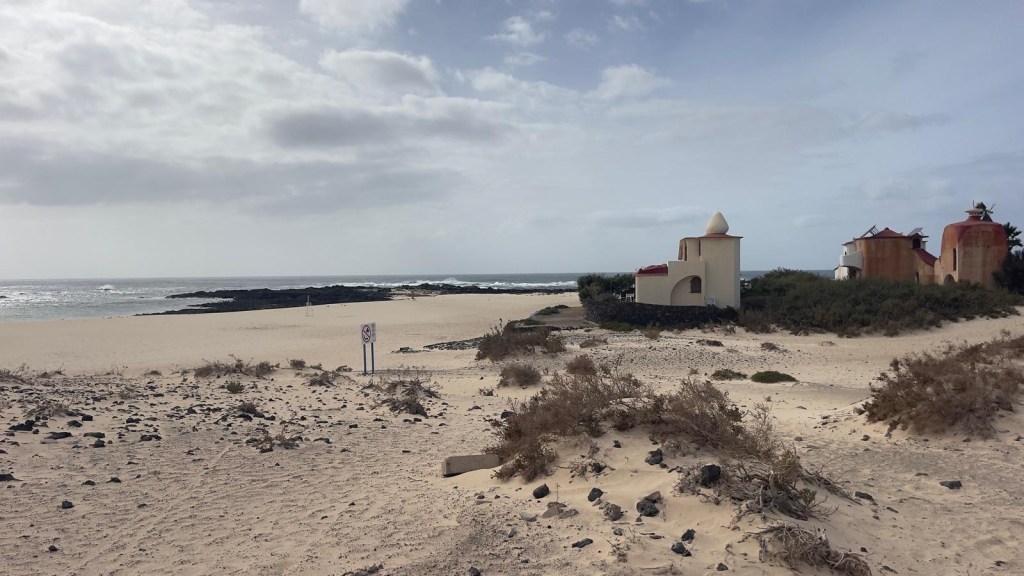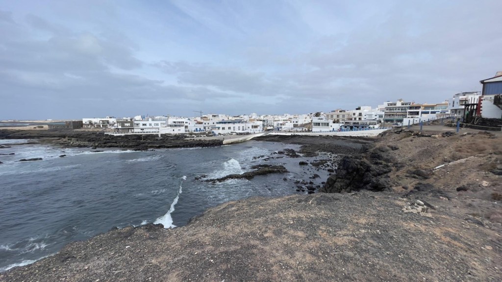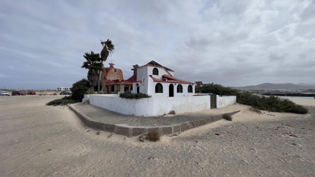 Sulla ampia spiaggia di arena chiara, si affacciano due residenze dal colore porpora e dalle forme singolari. Ci avviciniamo per scattare foto e poi ripartiamo per raggiungere il centro del paese di El Cotillo, che sembra poco di più di un minuscolo villaggio di pescatori.