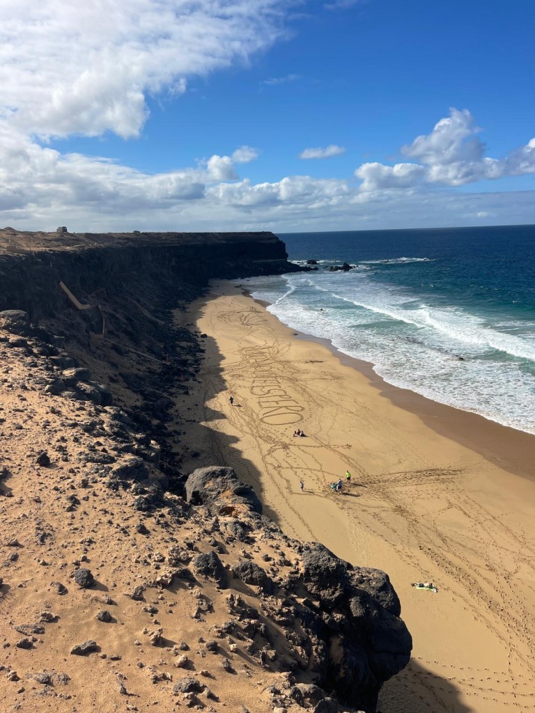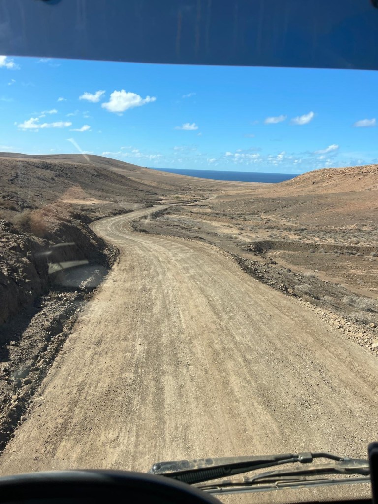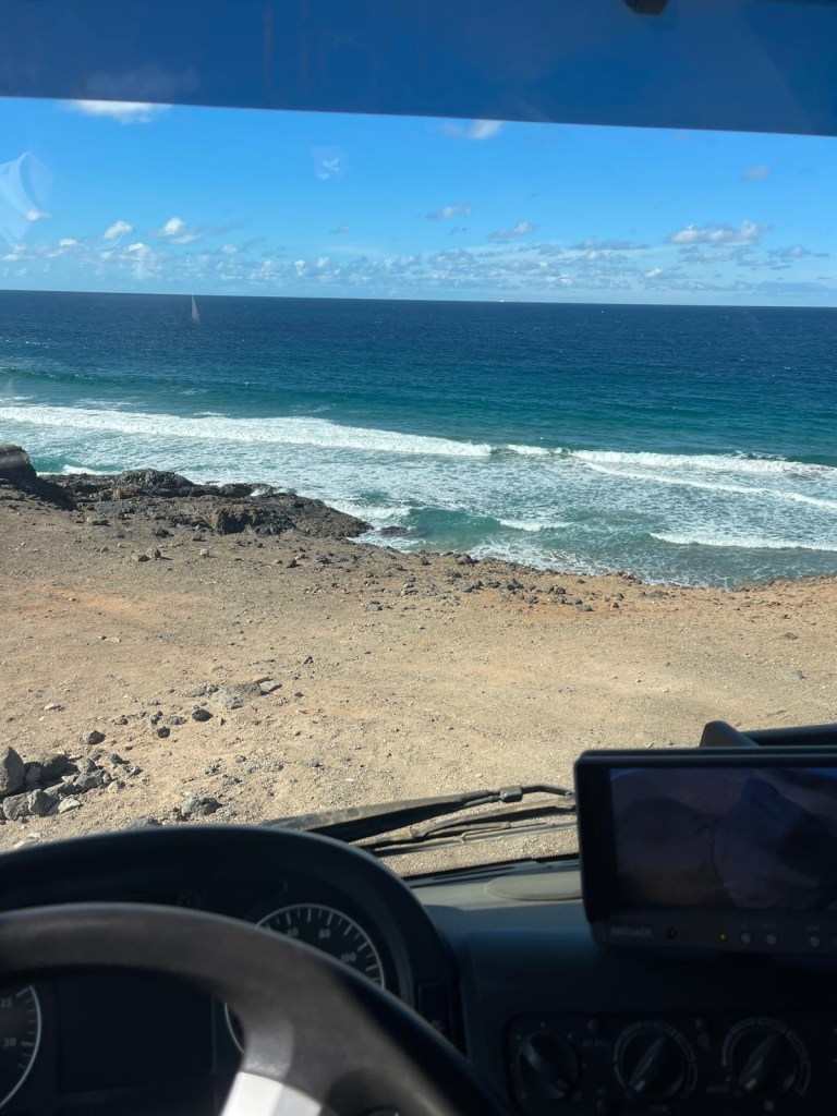 Superato El Cotillo, dove approfittiamo di rabboccare l’acqua, raggiungiamo la scogliera del Castillo. Da qui si gode un panorama bellissimo sulla costa. Il mare è mosso e, come sempre negli ultimi giorni, il vento si fa sentire. Procediamo verso sud e, ci fermiamo ad ogni insenatura per apprezzare la vista. Lo sterrato scorre lungo la scogliera, in quota sul mare. Ci sono delle spiagge ma sono raggiungibili solo a piedi. Playa Tebeto ospita un monumento ad un eroe che ha perso la vita per salvare una persona dalla risacca del mare sottostante. Cartelli di pericolo ed avvertenze sono presenti in ogni insenatura. Da una parte il mare impetuoso, dall’altra i coni vulcanici che si ergono sul paesaggio piatto e privo di vegetazione.