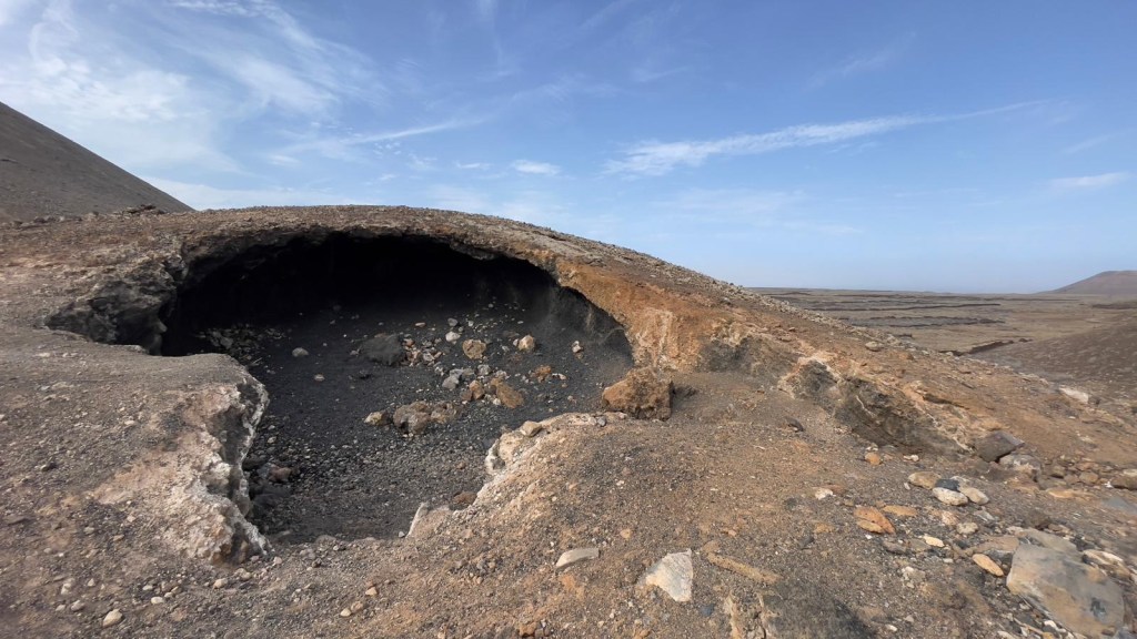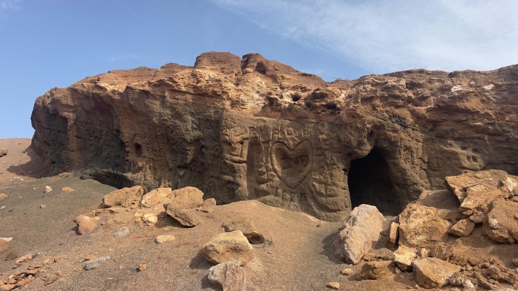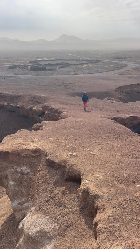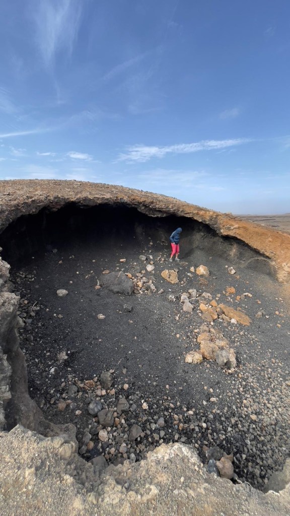 La mattina seguente, il 16, non piove ma è previsto molto vento. Prima di pranzo, imbocchiamo una strada sterrata ampia che da Corralejo conduce verso Lajares passando vicino alla bocca di un vulcano. Nonostante il tempo non sia bellissimo, sono molti i turisti che, a piedi, percorrono questa passeggiata in mezzo ai sassi per scoprire la montagna dalle strane forme e la bocca del vulcano. La strada è in sterrato non disconnesso, percorribile anche da auto normali. Terminato il sentiero, superiamo Lajares e passiamo da El Cotillo per fare il pieno di acqua. La nostra tappa finale è, ancora una volta, la spiaggia vicino al faro di Teston, dove abbiamo appuntamento con Cerstin e Rolf, i nostri amici tedeschi che avevamo lasciato a Lanzarote. Alle 15 eccoli arrivare nel punto di incontro. Pranzo e pomeriggio trascorsi insieme e domani…si vedrà.