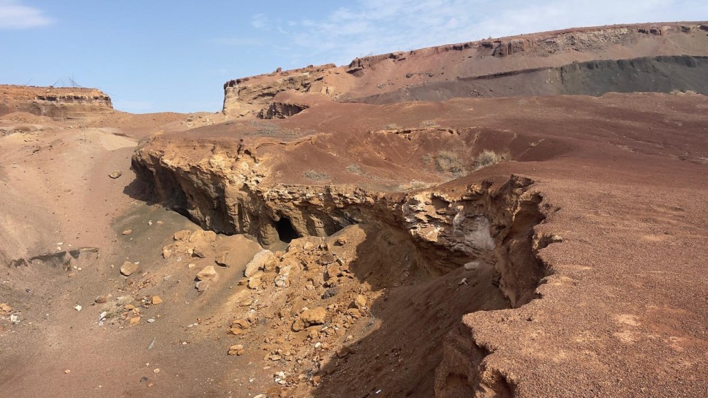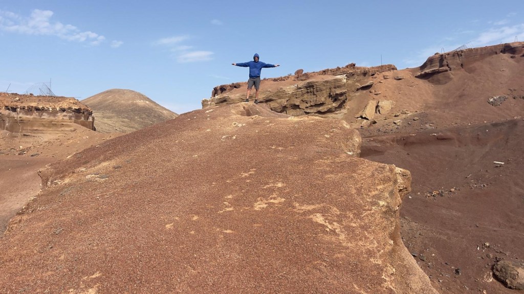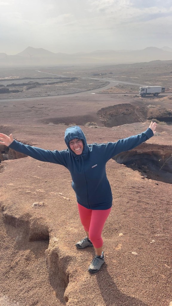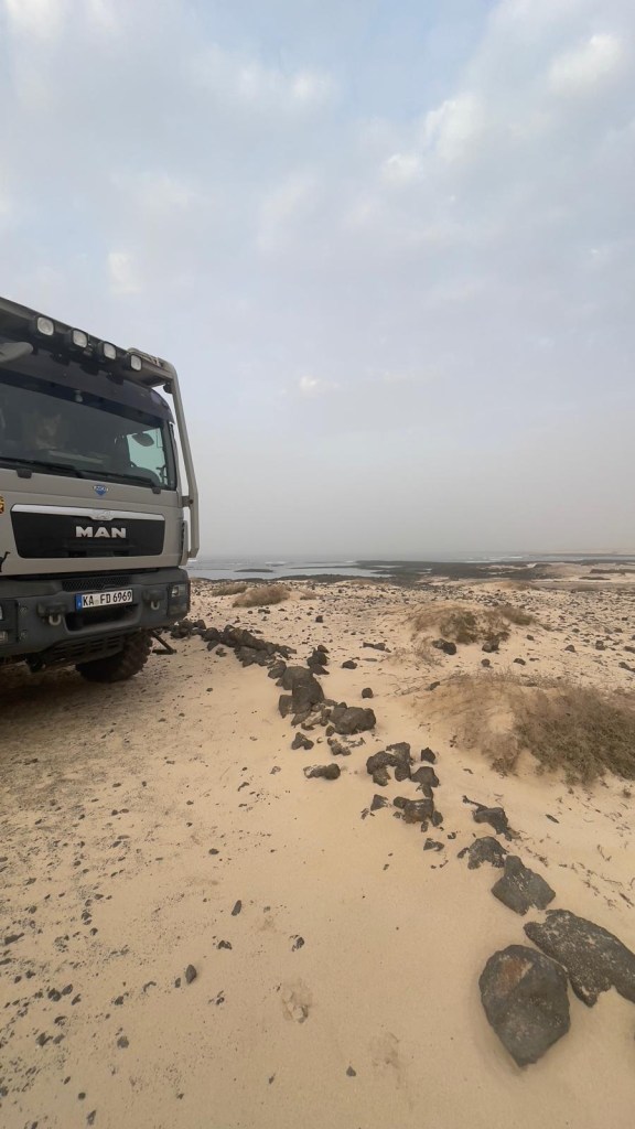 Durante la notte, è venuto a piovere e, la terra argillosa della spiaggia, si è trasformata in fango, rendendo alto il rischio di rimanere bloccati; prima ancora di fare colazione, decidiamo di spostarci in un luogo più sicuro. Lungo lo sterrato che ci avrebbe portato sull’asfalto, incontriamo un van completamente spanciato e il suo proprietario intento a scavare, nel tentativo di liberare il veicolo. Ci offriamo di aiutarlo e, una volta messo il camion sul terreno asciutto, Davide con il Quad, torna a recuperare il signore in difficoltà. Purtroppo le previsioni per oggi, non sono rassicuranti: pioverà tutto il giorno. Optiamo per raggiungere Corralejo e regalarci una colazione a base di brioche presso il centro commerciale. Parcheggiato a pochi metri di distanza, sotto la pioggia, raggiungiamo il bar pieno di italiani e, come loro ci sediamo ad un tavolo dopo aver ordinato cappuccino, brioche, è un succo di frutta per la “Modica” cifra di €12!