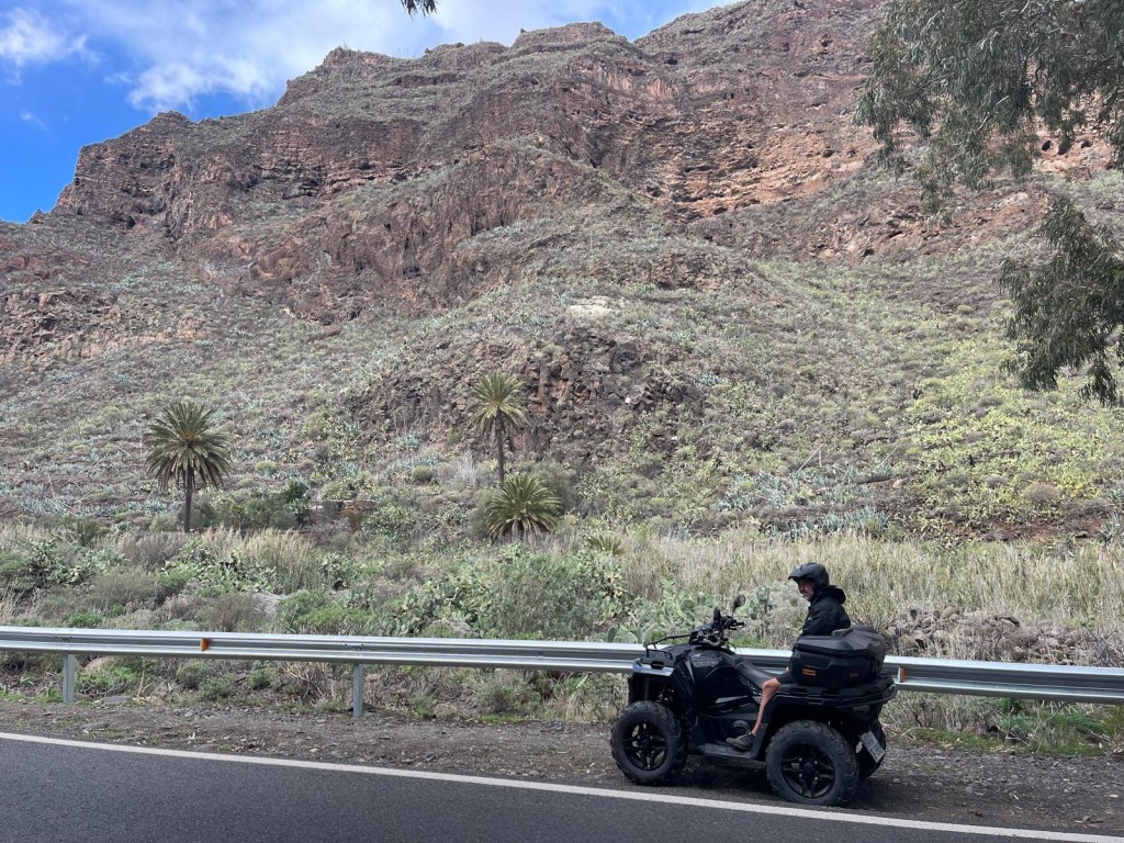 Raggiunta la cittadina di Aguimenes all’ora di pranzo, abbiamo trovato la chiesa ed i negozi chiusi. Fatto un giro a piedi nella piazza della graziosa cittadina, siamo poi ripartiti , con i Quad e la moto, per un giro panoramico sulle colline ed il barranco a nord di Aguimes, fino a raggiungere quasi Telde. La montagna è rigogliosa ed il panorama molto affascinante.