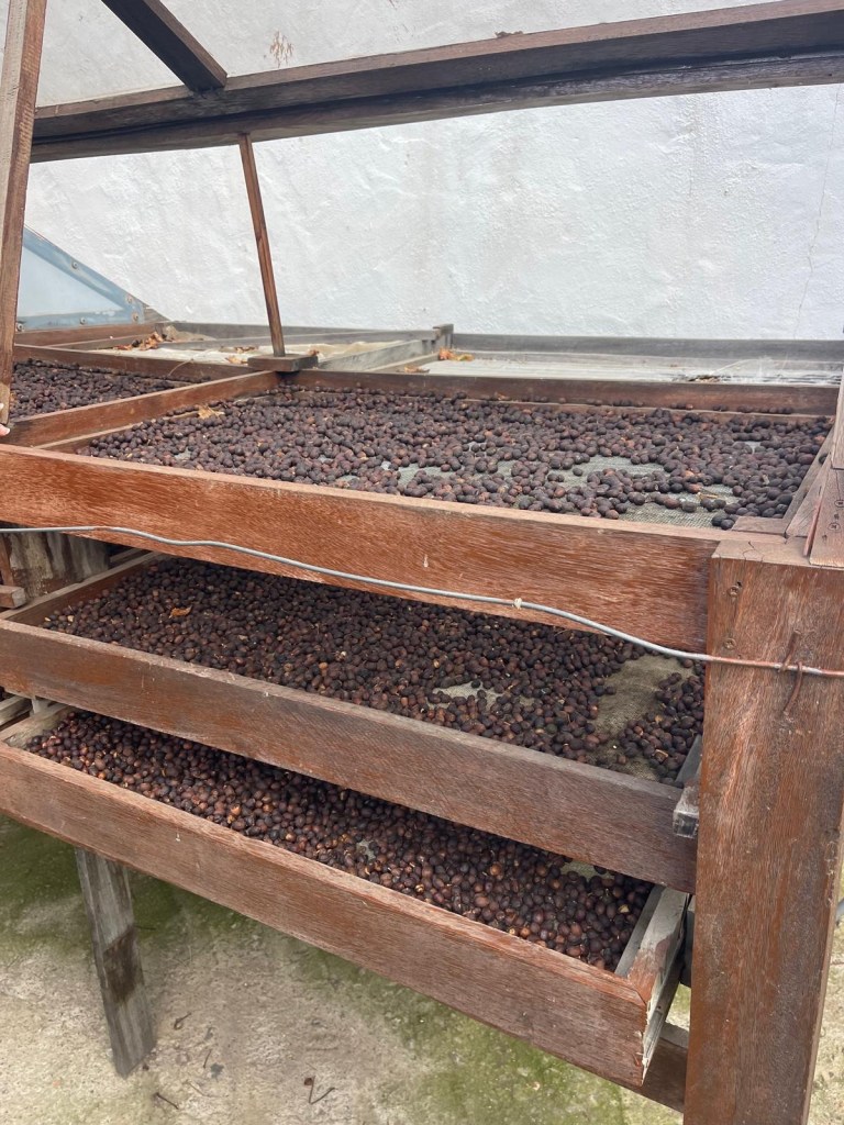 Dopo la raccolta, le bacche vengono poste all’aria ad essiccare per circa una ventina di giorni e poi passate in una macchina che toglie la buccia esterna che, da rossa, è diventata quasi nera.