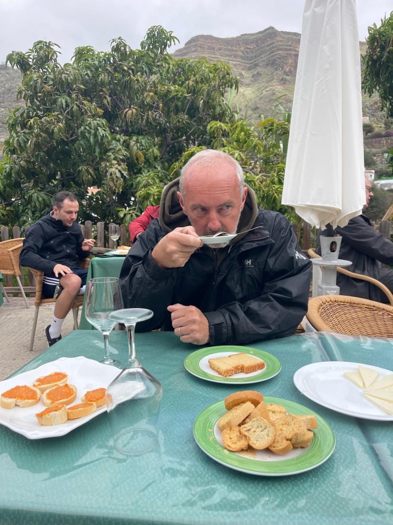 Vengono offerti tre vini distinti: un bianco, una rosato ed un rosso, accompagnati da formaggio di capra, marmellata mista frutta e caffè, pane con chorizo di Teror spalmato e, per finire, una ottima tazza del loro prezioso caffè.