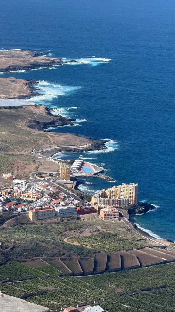 Il panorama lungo il tragitto è incredibile: la vista spazia sulla costa, tra scogliere imponenti e l’azzurro dell’oceano. Decidiamo di non fermarci a Garachico oggi, preferendo visitarla domani con il Quad. Proseguiamo invece per Buenavista del Norte, dove troviamo un’area di sosta camper asfaltata e fronte mare.