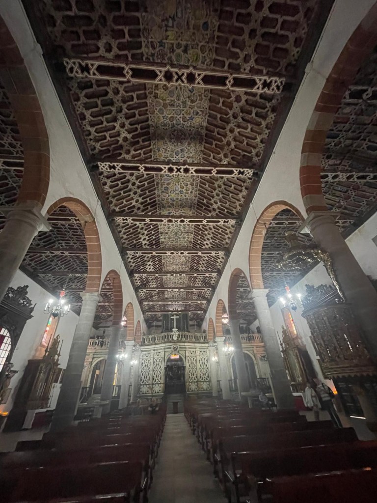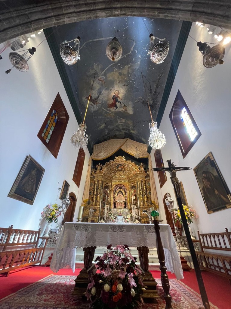 L’interno è spettacolare: il soffitto in legno scolpito in stile mudéjar, gli splendidi lampadari di cristallo e un altare scintillante in argento che circonda la statua della Vergine Maria. Si dice che questa statua, la più antica delle Canarie, risalga al V secolo e sia stata portata qui da mercanti prima dell’arrivo degli spagnoli. Ogni cinque anni viene condotta in processione fino a Santa Cruz in una celebrazione molto sentita dagli abitanti.