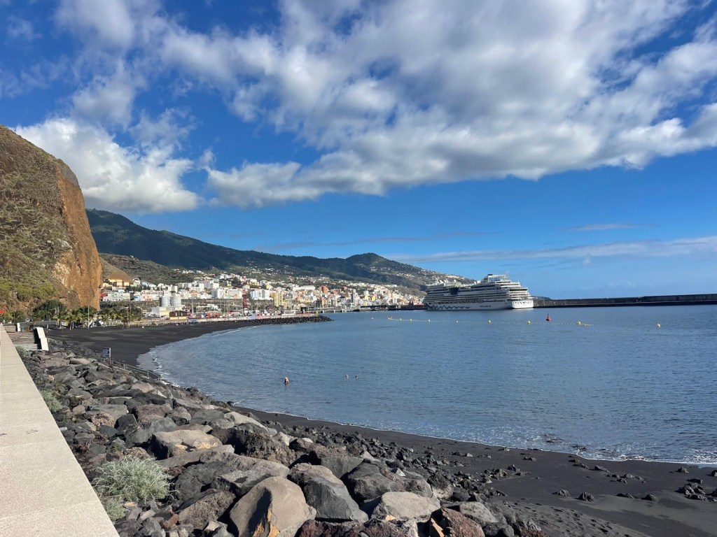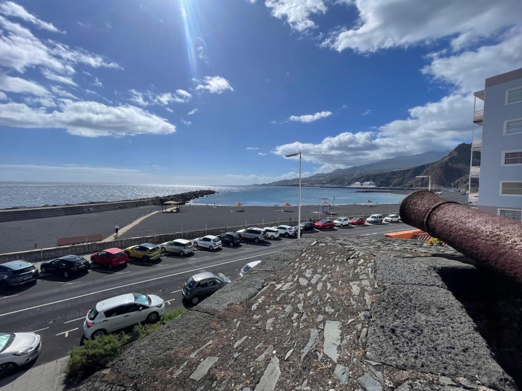 Da qui si ammira la spiaggia di Santa Cruz de La Palma, una magnifica distesa di sabbia nera vulcanica protetta dal vento, perfetta per un bagno tranquillo. Sulla spiaggia si trovano grandi ombrelloni in legno che offrono riparo dal sole.