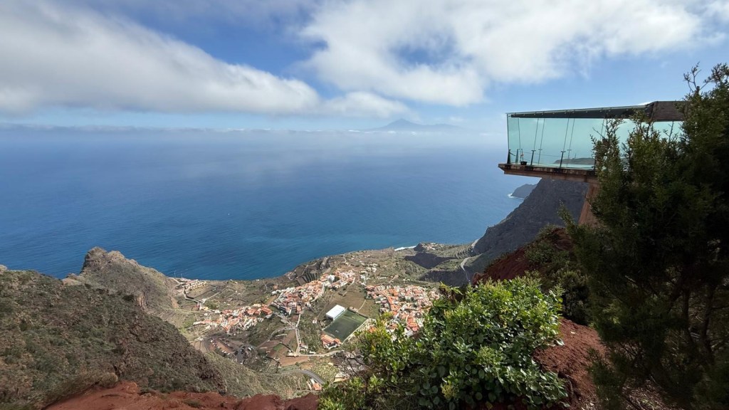 Questa mattina decidiamo di tornare sui nostri passi per circa 20 km, direzione Mirador de Abrante, una delle attrazioni più spettacolari del Parco Nazionale di Garajonay. A bordo del Quad, facciamo una prima tappa nel punto in cui avevamo pranzato il giorno precedente, percorrendo il crinale della montagna e immortalando il paesaggio con il drone. Dopo altri 8 km raggiungiamo il Mirador, famoso per la sua passerella panoramica interamente in vetro sospesa nel vuoto. Da qui, la vista spazia fino a Tenerife, con il maestoso Teide all’orizzonte, mentre ai nostri piedi si estende il pittoresco villaggio di Agulo, con le sue case colorate affacciate sull’Atlantico.