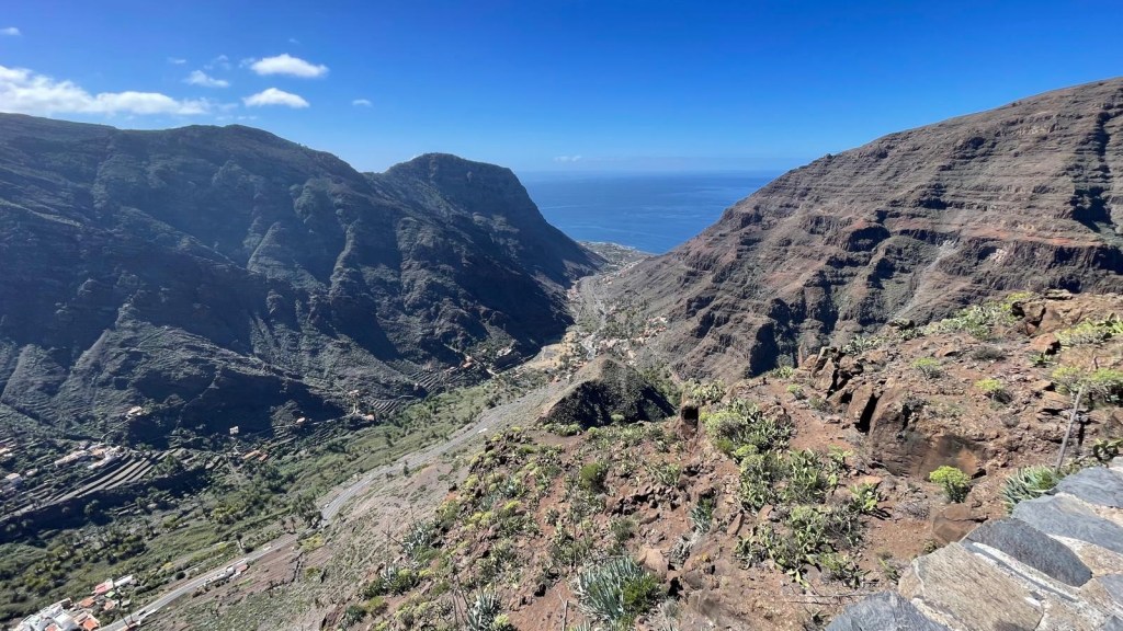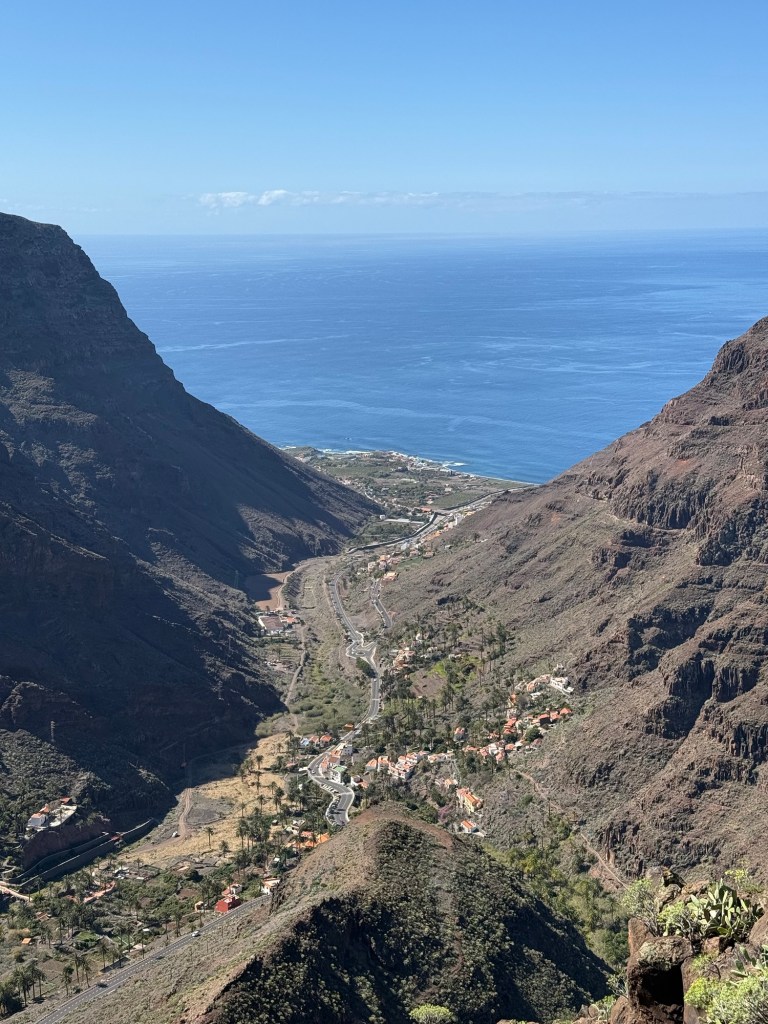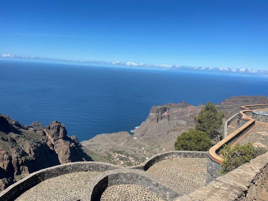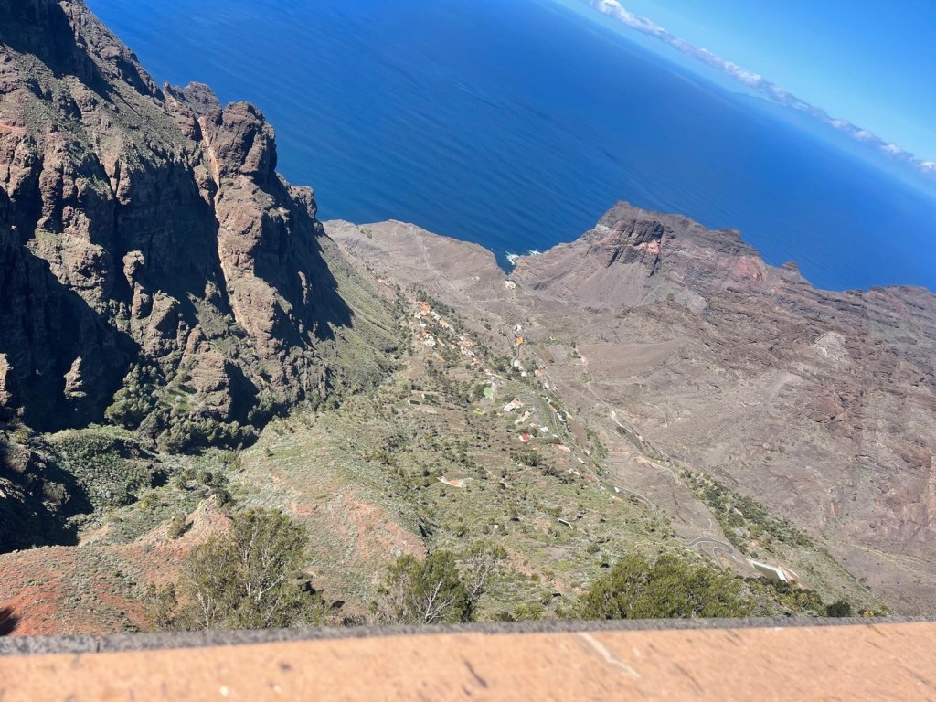 Lasciato il camper lungo la strada principale, abbiamo proseguito con il Quad fino al Mirador Ermita del Santo, uno dei punti panoramici più spettacolari dell’isola. Da qui, la vista si apre sull’oceano e sulle isole vicine, El Hierro e La Gomera. Sotto di noi, si estende un’impressionante gola, con una strada che serpeggia fino alla costa.