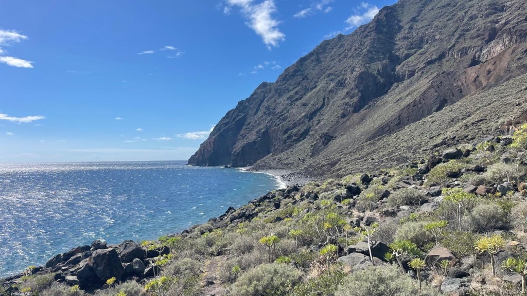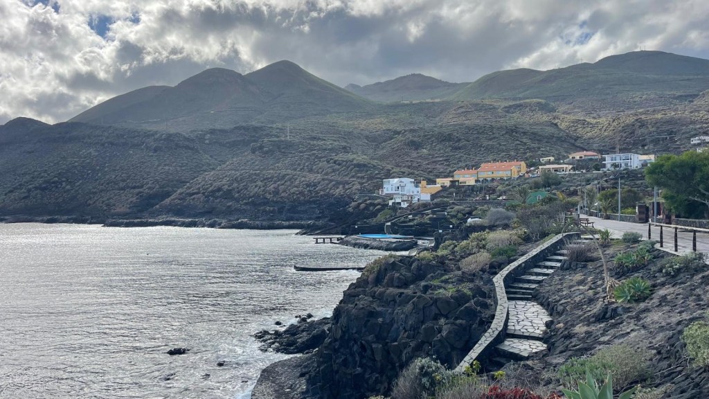 La nostra giornata è iniziata ripercorrendo la strada che ieri sera ci ha condotti fino alla nostra sosta notturna, nella zona di Las Playas. Questo tratto di costa è caratterizzato da spiagge di ciottoli neri di lava, lambite da acque cristalline e sovrastate dalle imponenti scogliere di Las Playas, alte fino a 1000 metri. Qui si trova anche il suggestivo Parador de El Hierro, un hotel affacciato direttamente sull’oceano, che gode di una posizione privilegiata tra il mare e le montagne.