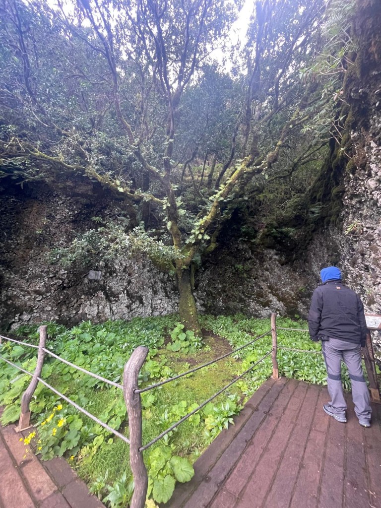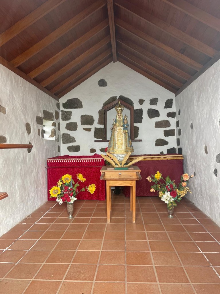 Nonostante il freddo, decidiamo di proseguire verso il Mirador de Jinama, a circa 3,5 km da San Andrés. Purtroppo, quando arriviamo, la vista è completamente oscurata dalla nebbia. L’unica cosa che riusciamo a visitare è la Cappella della Virgen de la Caridad, un piccolo edificio religioso situato accanto al belvedere.