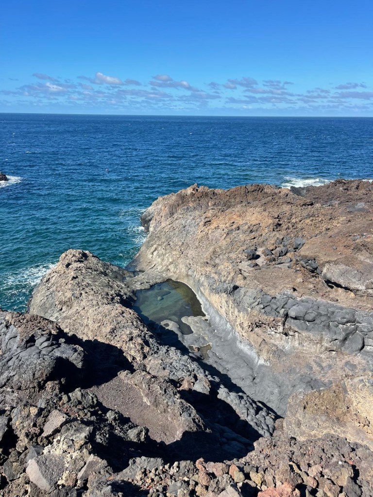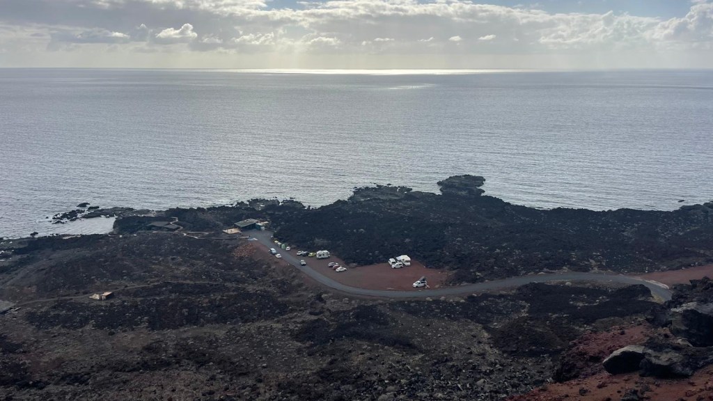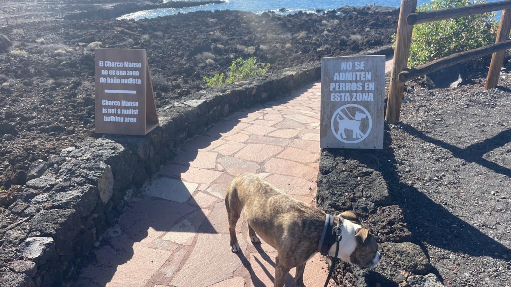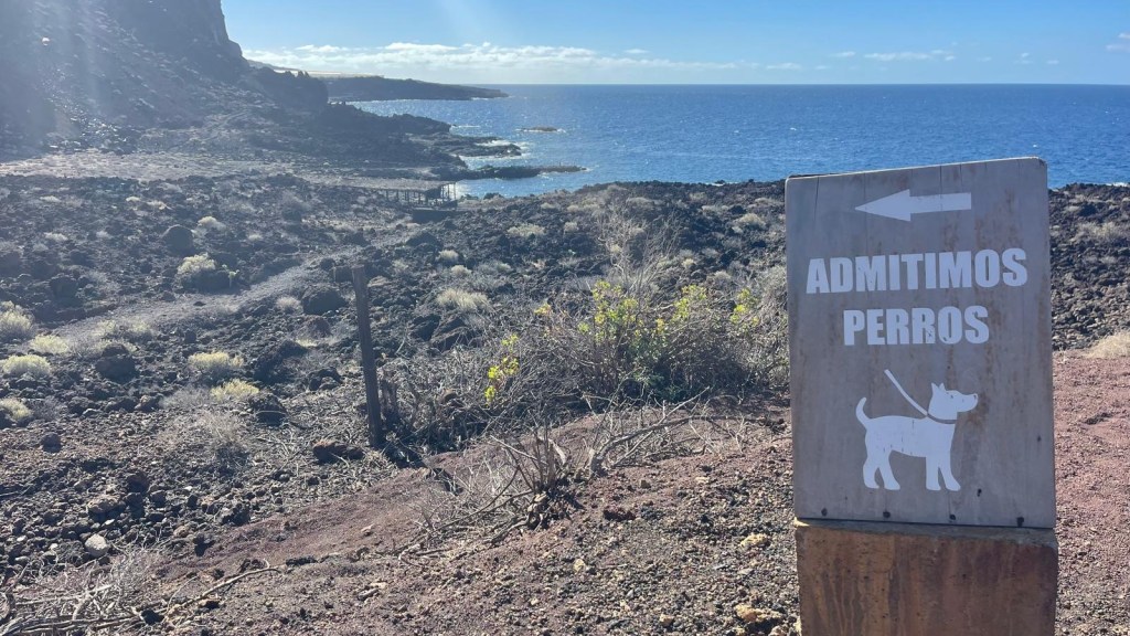Decidiamo di proseguire fino alla Cala de Tacorón, un angolo di paradiso nascosto tra scogliere vulcaniche. Qui, il mare è sempre calmo e il sole splende per gran parte dell’anno. Il paesaggio è surreale: rocce scure e aspre si ergono attorno alle calette, creando un contrasto spettacolare con il blu intenso dell’oceano. L’area picnic, realizzata con tronchi e dotata di barbecue, è un luogo perfetto per una sosta. Noi preferiamo parcheggiare alla fine di una strada sterrata per goderci un po’ di privacy e lasciare i cani liberi di esplorare.