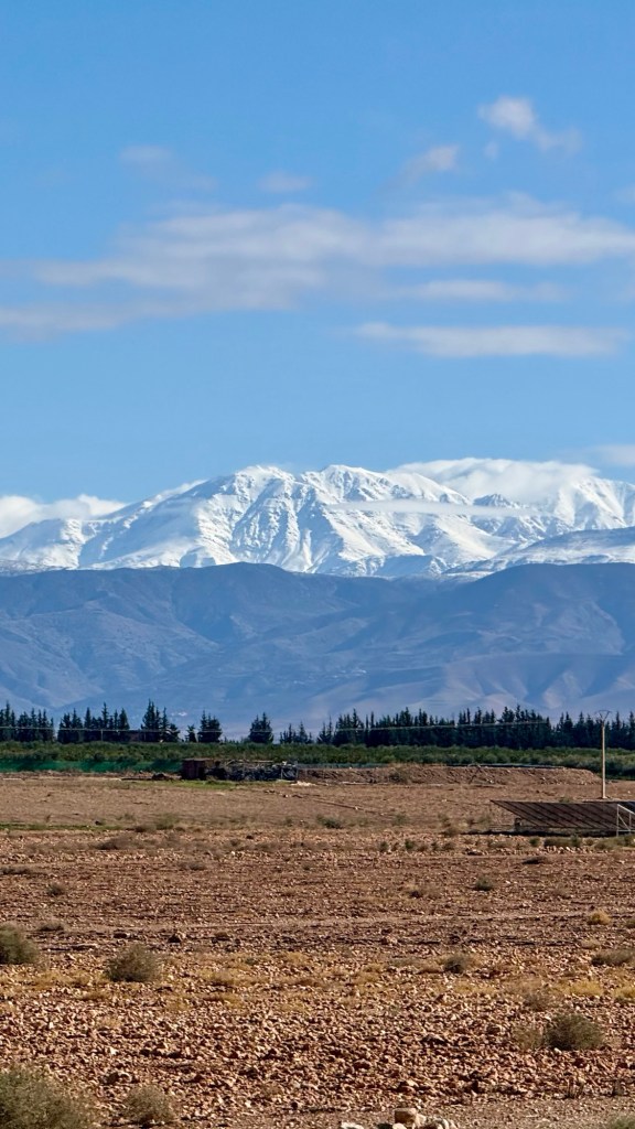 Le pianure dalla terra rossa, ricoperte da arbusti verdi che luccicavano ancora bagnati dalle gocce di pioggia; i corsi d’acqua di color mattone per l’argilla ed il ferro contenuti nella terra; le colline scure e sullo sfondo le montagne imbiancate dalla neve caduta a sud di Marrakech (tizi-n-test)…un paesaggio che ci ha regalato nuovamente il sorriso dopo due giorni di pioggia ininterrotta, che ci aveva ingrigito l’animo.