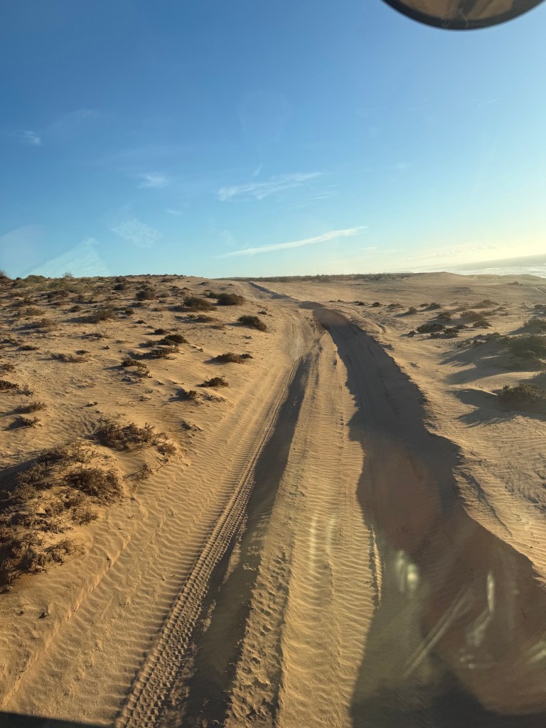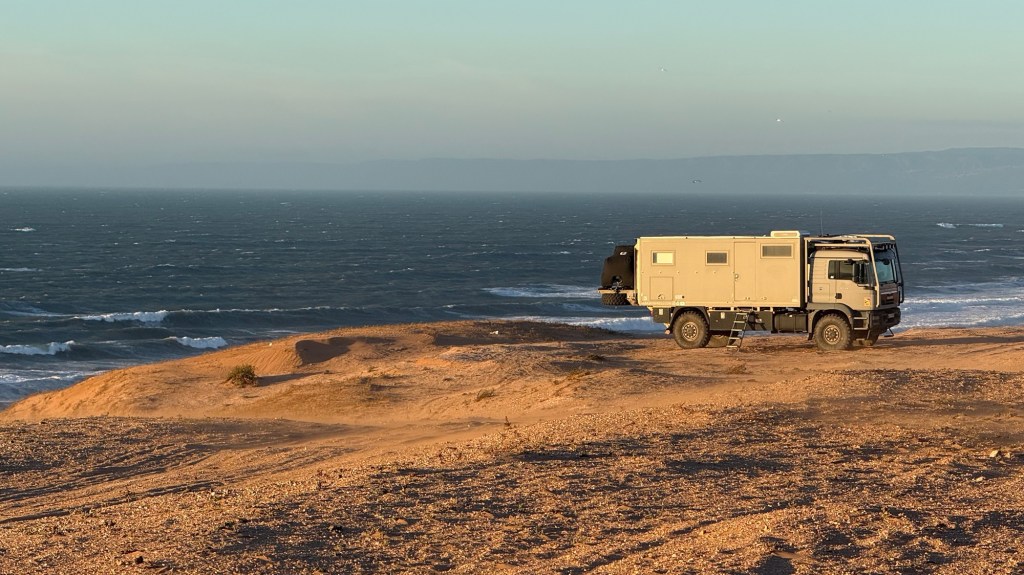 Lungo il percorso, decidiamo di sostare sulla sabbia per la notte, dondolati dal vento che letteralmente scuote il Truck.