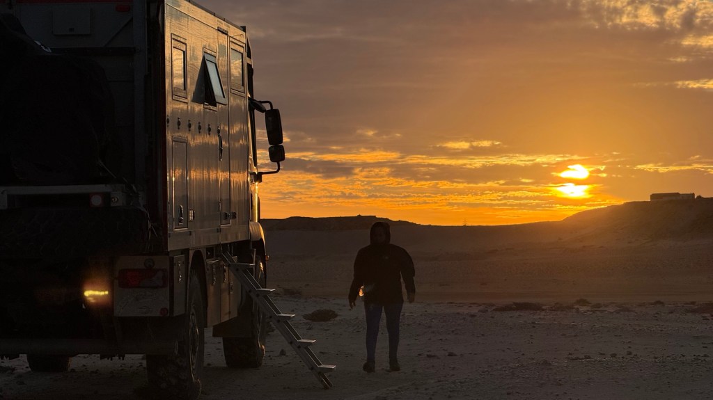 Parcheggiato in mezzo al nulla, con un panorama incredibile tutto intorno, scendiamo dal camion a fare qualche foto al tramonto. E’ deserto, in tutti i sensi.
