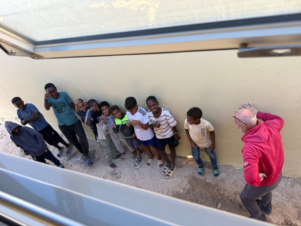 Abbiamo approfittato della sosta e del rubinetto dell’acqua per rifornire i serbatoi, in compagnia di una decina di bambini che, incuriositi più dai cani che da noi, ci hanno subissato di domande o frasi dette a vanvera per far sapere che sapevano qualche parola in inglese.